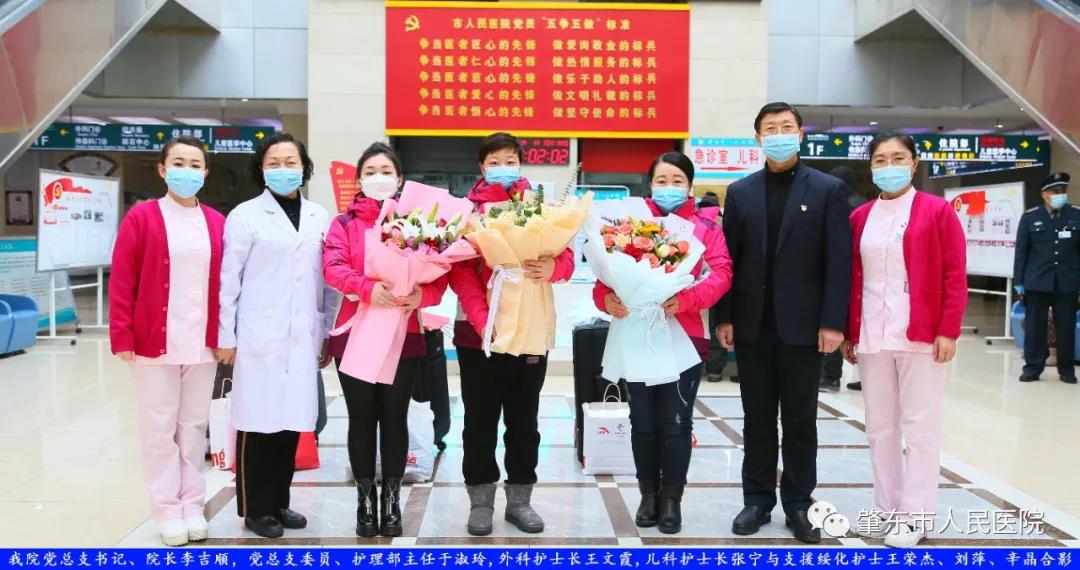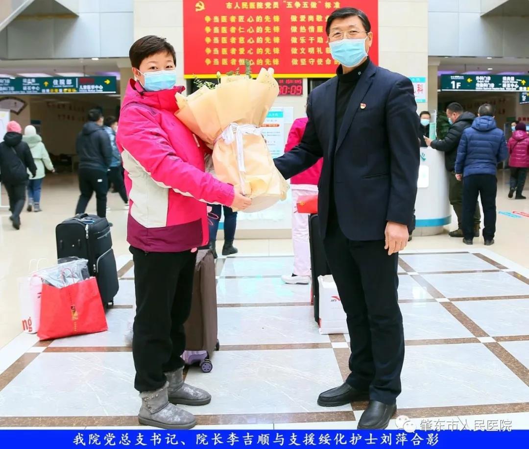 此次趕赴綏化,是我院繼趙志剛、溫明馳援湖北,欒宏偉、趙虹琪、劉文宇支援綏化后的再次出征。出發(fā)前,我院在門診大廳舉行了短暫而又莊重的歡送儀式。沒有太多的祝福和掌聲,一切都太過匆匆,大家都太過忙碌,全院醫(yī)務(wù)工作者都各自奮戰(zhàn)在如火如荼的全民抗疫工作當(dāng)中,人民醫(yī)院黨總支書記、院長李吉順,黨總支委員、護(hù)理部主任于淑玲代表全院職工向三名護(hù)理工作者送去鮮花和祝福,希望她們此次出征能夠不負(fù)使命、不負(fù)重托,充分發(fā)揚(yáng)崇高的職業(yè)精神,在工作當(dāng)中服從指揮、服從大局,忠于職守、相互配合,同時也要注意防寒保暖,做好個人防護(hù)。并祝愿她們能夠光榮出征,平安履職,勝利凱旋。