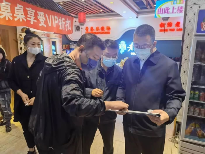 單奎副市長一行重點檢查了餐飲、藥店以及鴻泰水果批發(fā)市場、陽光農(nóng)貿(mào)市場等業(yè)態(tài),對各場所進門測溫、掃碼、戴口罩以及消殺等防控措施執(zhí)行情況進行了細(xì)致檢查。