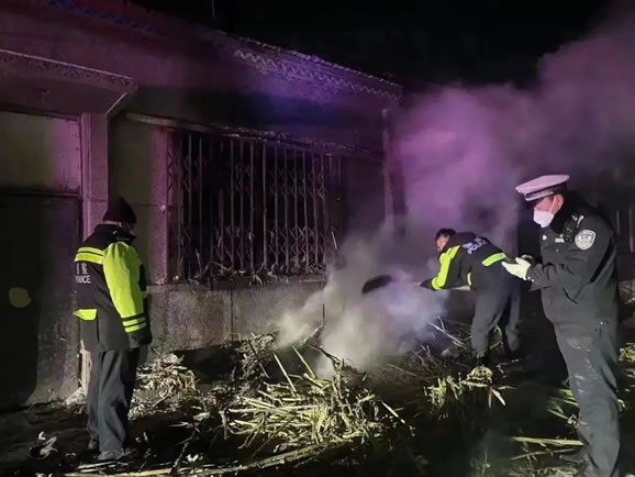到達現場后,發現現場的三間平房門窗和旁邊柴草垛已經燃燒起來,張曉偉高喊著“大家注意安全”讓房主將電閘拉下后冒著濃煙沖進屋內,快速搜尋后,確定屋內沒有人和其他易燃易爆物品,此時他已顧不上被煙嗆的咳嗽不斷,眼淚漣漣!奮不顧身帶領民警張廣天和楊旭東等5名輔警拿著滅火器沖入火場滅火,經過眾人二十分鐘的努力,現場已看不到明火,此時消防大隊官兵和派出所民警趕到現場將火徹底撲滅。求助群眾望著全身淋濕被熏黑的交警們感動的連連道謝,由于撲救及時沒有蔓延到周邊住戶房屋,保護了人民群眾生命和財產安全,火被撲滅后,張曉偉帶領六名民輔警返回了疫情防控的崗位中。