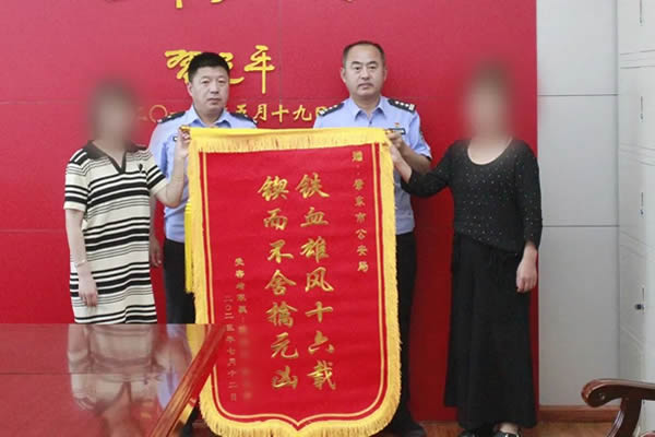 7月12日,“2007.10.16”特大搶劫殺人案被害人家屬,來到肇東市公安局將一面印有“鐵血雄風(fēng)十六載,鍥而不舍擒元兇”的錦旗送給辦案民警,以表達(dá)感激之情。