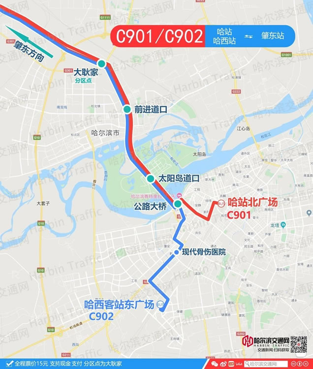 肇東至哈市城際公交分為兩條線路。其中,C901路始至哈站,C902路始至哈西站。主要站點途經“肇東火車站”、“三道街”站、“大耿家”站、“前進道口”站、“太陽島道口”站、“公路大橋”站、“哈站北廣場公交首末站”、“哈西客站東廣場”站" />