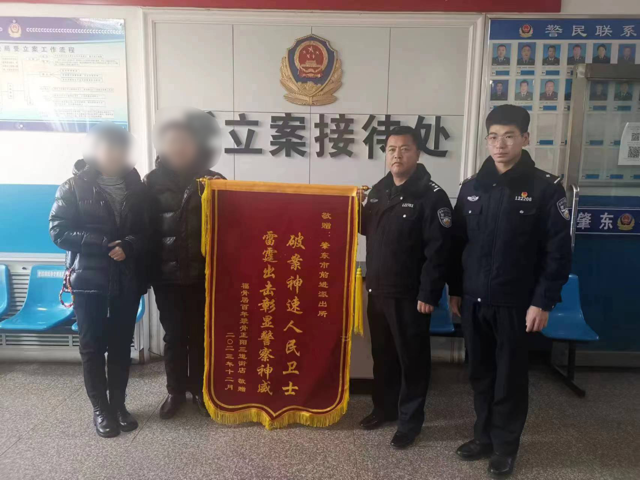 “警察同志,真的太感謝你們了......”12月11日上午,一面印有“破案神速人民衛士 雷霆出擊彰顯警察神威”的錦旗送到肇東市公安局前進派出所民警手中,對民警快速破獲盜竊案,為其挽回損失表示感謝。