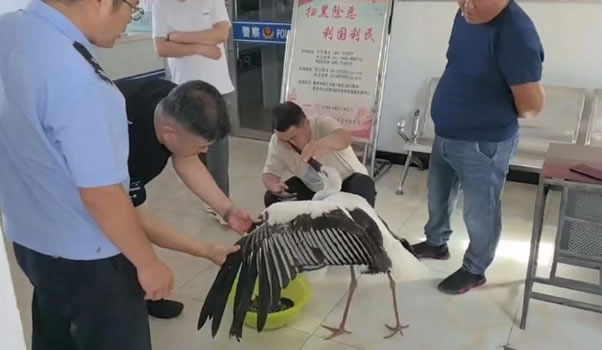 8月28日,躍進(jìn)鄉(xiāng)福龍村書(shū)記宋健來(lái)到肇東市公安局躍進(jìn)派出所,稱在躍進(jìn)鄉(xiāng)福龍村新發(fā)屯草甸子上發(fā)現(xiàn)一只大鳥(niǎo)晃晃蕩蕩落在草甸子上,不斷哀鳴。大鳥(niǎo)體長(zhǎng)120厘米左右,身上大部分呈白色,翅膀下方呈黑色,嘴部呈黑色,嘴的基部較厚,往尖端逐漸變細(xì),并且略微向上翹,前頸的下部有呈披針形的長(zhǎng)羽,腿部較長(zhǎng)。但他一下子想不起來(lái)鳥(niǎo)的名字,只是知道它應(yīng)該是保護(hù)動(dòng)物,因此請(qǐng)求派出所進(jìn)行救助。宋健介紹不知為什么,發(fā)現(xiàn)時(shí)這只大鳥(niǎo)不飛、不動(dòng),行動(dòng)遲緩,也不曾進(jìn)食,走上前也不怕,站在原地,他趕緊將它抱到派出所。民警看到大鳥(niǎo)后宛如“仙鶴”下凡,優(yōu)美的體態(tài),潔白的羽毛,朱紅色的眼眶,寬而長(zhǎng)的翅膀,一看就是不尋常的鳥(niǎo),民警擔(dān)心它有傷或是生病了,立即聯(lián)系肇東市林業(yè)部門,尋求專業(yè)的指導(dǎo);經(jīng)專家仔細(xì)辨認(rèn),這只鳥(niǎo)類并不是“仙鶴”,而是被譽(yù)為“鳥(niǎo)中大熊貓”的東方白鸛,是國(guó)家一級(jí)保護(hù)動(dòng)物。經(jīng)初步檢查,其外表沒(méi)有明顯傷痕,右側(cè)翅膀受點(diǎn)輕傷耷拉下來(lái),但整體狀態(tài)較為虛弱,民警在派出所設(shè)置臨時(shí)保護(hù)區(qū)域,確保動(dòng)物的安全,避免其受到二次傷害,民警拿來(lái)小魚(yú)和水進(jìn)行投喂,白鸛簡(jiǎn)單吃了幾只小魚(yú)。隨后民警對(duì)村書(shū)記的救助行為表示感謝。