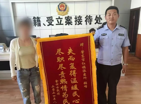 9月2日上午,哈爾濱市民金女士來到肇東市公安局紅旗派出所,將一面繡有“失而復得溫暖民心 盡職盡責熱情為民”的錦旗交到民警手中,感謝民警幫助她找回遺失的手機。