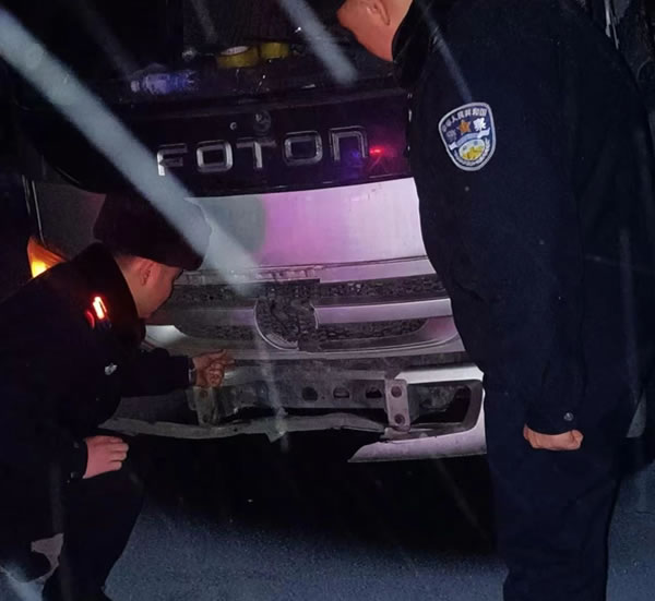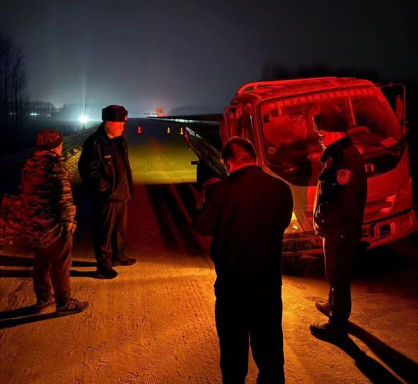 2024年11月27日20時許,家住哈爾濱市的個體司機王先生駕駛自營奧鈴牌貨車行駛至哈肇高速銀山服務區附近時,因粗心大意未做好車輛日常檢查,再加上道路冰雪濕滑,致使右側前輪脫落10余米,車輛發生單方事故。接到求助后,民輔警迅速協調因道路結冰封閉的哈肇高速,第一時間進入高速公路開展施救。到達現場后,民輔警一邊安撫群眾情緒,一邊查看車輛輪胎情況并詢問車主是否還有備胎。同時聯系救援拖車,將事故車輛拖至安全路段。受冷空氣影響,因剛下過大雪,夜間溫度極低。但民輔警絲毫沒有受嚴寒天氣影響,考慮到群眾回家的急切心情,無一人嫌麻煩和放棄。經過近半個小時的不懈努力,終于幫群眾將車帶離事故區域。
