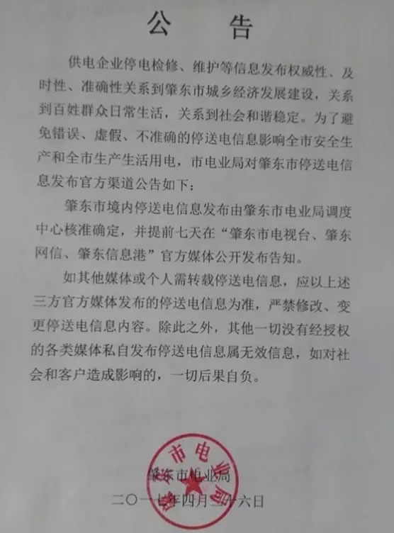 如其他媒體或個人需轉載停送電信息,應以上述三方官方媒體發布的停送電信息為準,嚴禁修改、變更停送電信息內容。除此之外,其他一切沒有經授權的各類媒體私自發布停送電信息屬無效信息,如對社會和客戶造成影響的,一切后果自負。