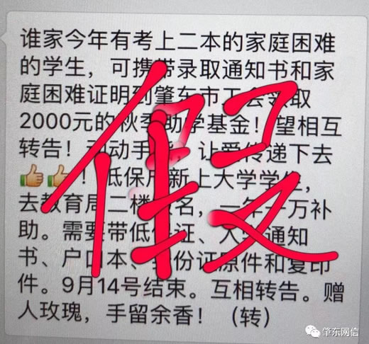 近日,一則內容為“誰家今年有考上二本的家庭困難的學生,可攜帶錄取通知書和家庭困難證明到市工會領取2000元的秋季助學基金”的消息在微信朋友圈和群聊中頻頻傳播,并引發關注。
