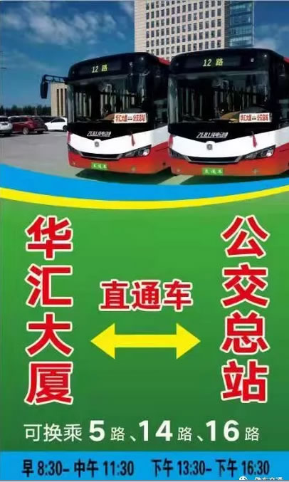 班車運行時間為早8點至11點、下午1點至4點,由紫都花園小區正門北發車,途徑生態園林南路,直達華匯大廈。城鄉居民可乘坐5路、14路、16路公交車抵達公交總站后,換乘12路“直通車”。