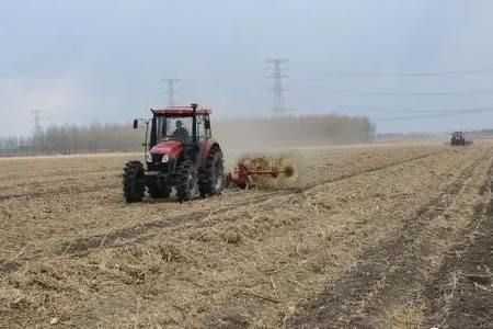 11月20日,肇東市向陽鄉(xiāng)田間地頭一臺(tái)后置式秸稈歸行機(jī)正在收集玉米秸稈。