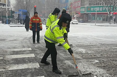 城區,交警堅守崗位,加大指揮疏導力度,及時救助行人和受困車輛,維護正常道路交通秩序。在人民小學和肇東火車站,城鎮一中隊中隊長張曉偉帶領隊員,與環衛部門一同清理道路積雪,方便車輛和行人通行。